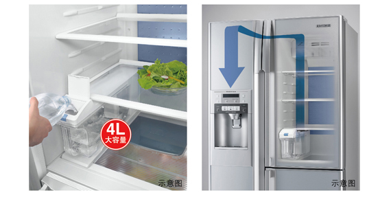 矿泉水、蒸馏水或冷开水等注入内置储水盒的饮用水,流经3层水源过滤网后,便会自动制冰。储水盒给水系统无需连接水管,可省去外接水管及过滤装置的麻烦。冰箱放置更加自由方便。4L大容量储水盒,可取出清洗,洁净方便。